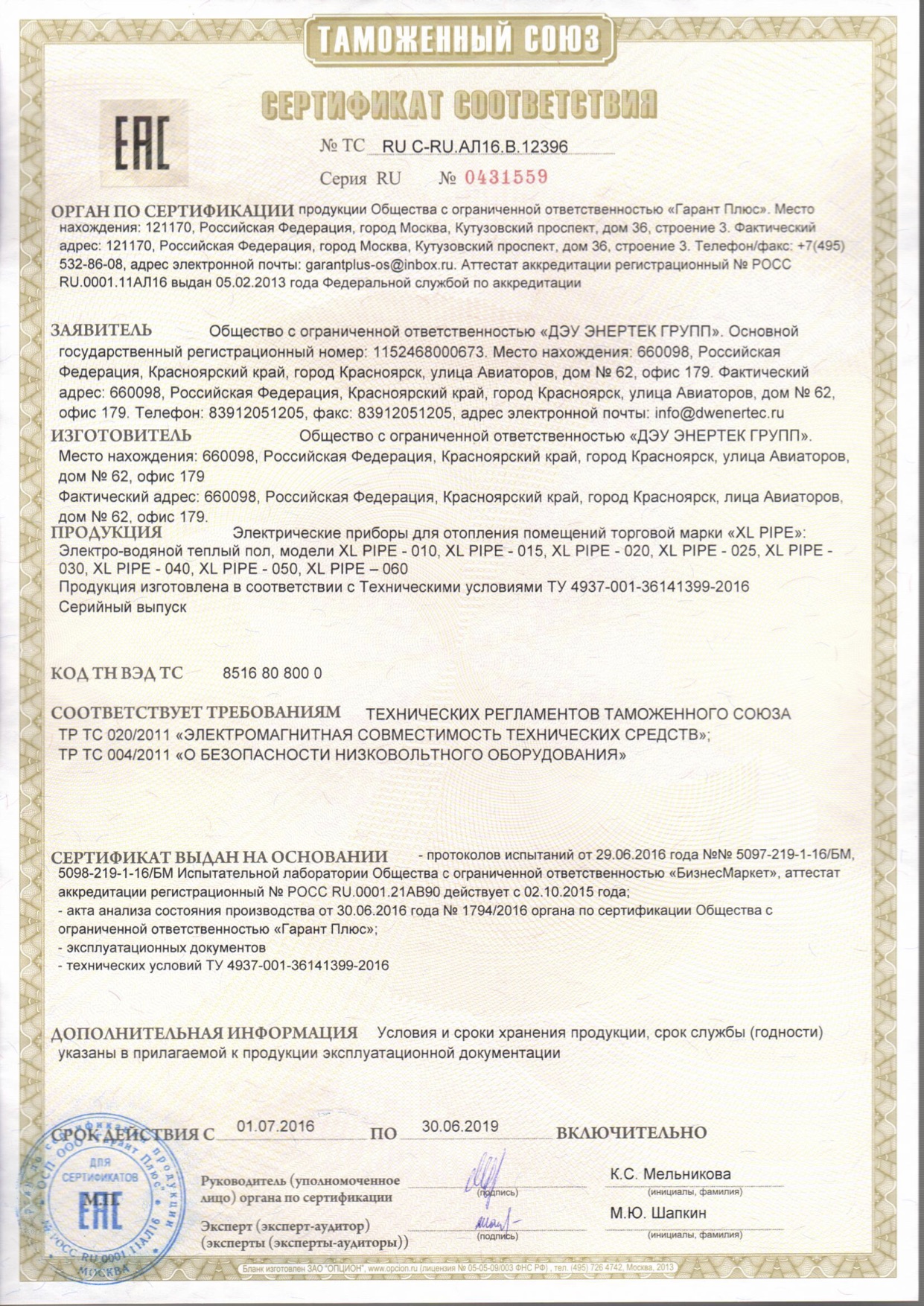Все комплектующие в системе XL PIPE заводского производства: семижильный нихромовый кабель, система поглощения давления, соединительные фитинги и прочие детали.